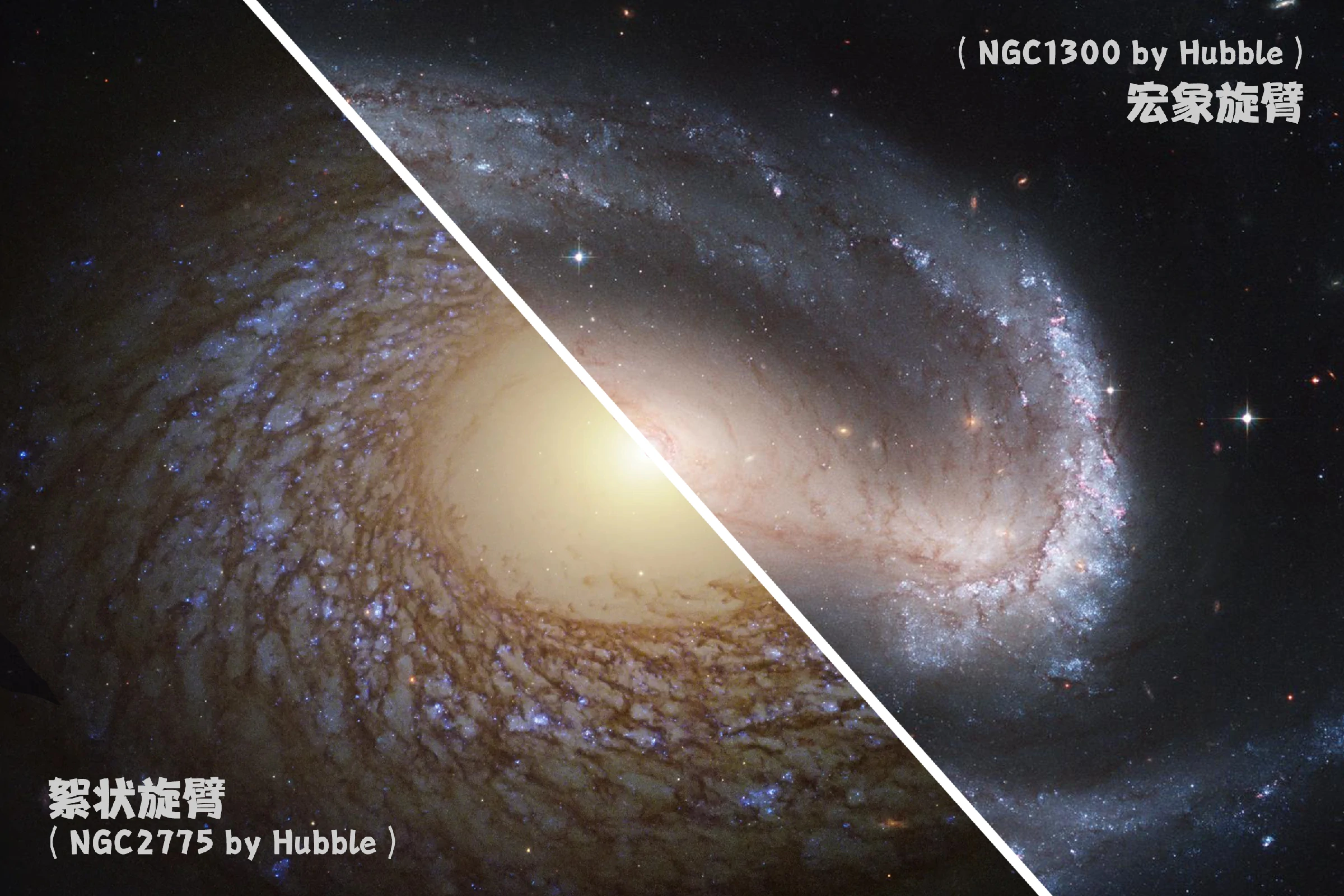 宇宙中的星系大致可以分为椭圆星系、旋涡星系、不规则星系三大类。旋涡星系的旋臂各式各样、纷繁华丽,所以吃吃天文科普认为旋涡星系是最美丽的。如果旋臂显示出一条条巨大的、泾渭分明的亮带,那么旋臂就是**宏象的(grand design);如果旋臂是多斑块状的、亮带一缕缕相互交叉的,那么旋臂就是絮状的(flocculent or feathered)**;当然也有介于两种之间的。图中所示的是特征非常明显的一条宏象旋臂、一条絮状旋臂。